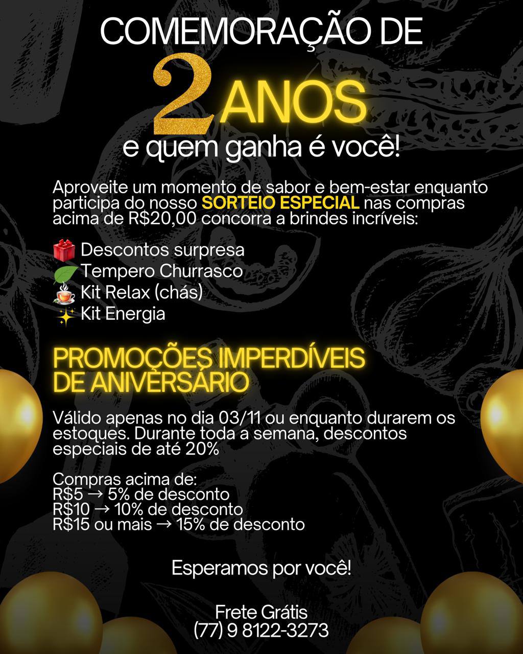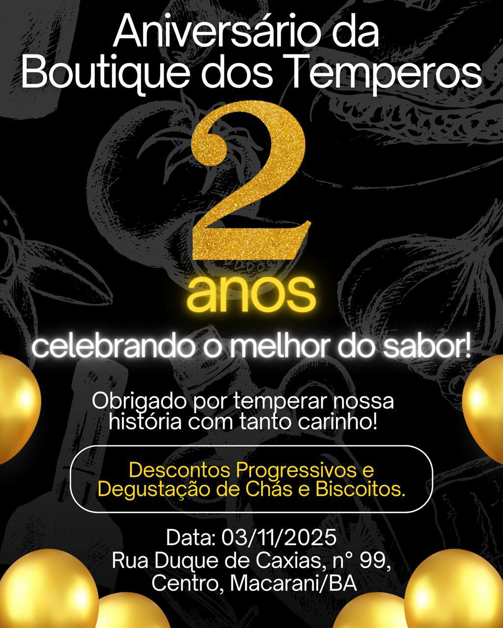 A Boutique dos Temperos, loja de temperos, especiarias e produtos naturais localizada na Rua Duque de Caxias, nº 99, no centro de Macarani, ao lado da Brasil Gás, está comemorando 2 anos de funcionamento neste dia 3 de novembro e preparou uma programação especial para os clientes.